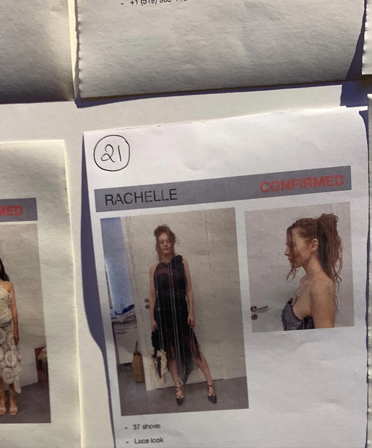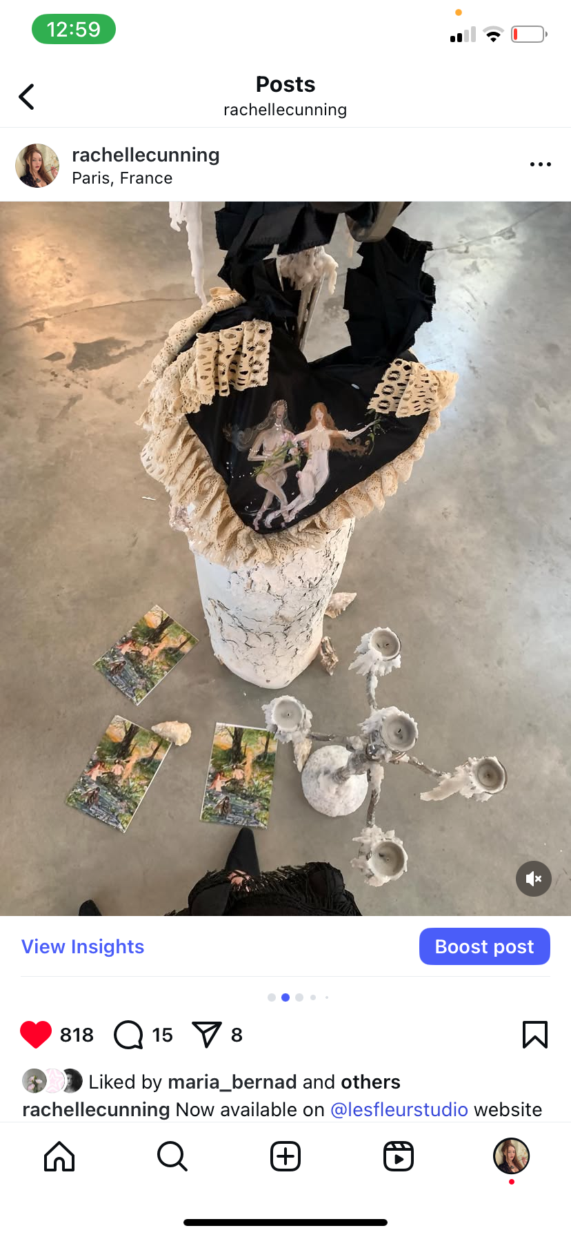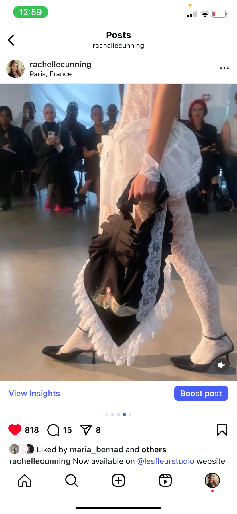 For the very first Les Fleurs Studio by Maria Benard runway show, Maria reached out to Rachelle to create a limited edition bag collection, Rachelle is known for upcyling her bags, and painting on them, finding ways to bring old relics to life with in a painterly poetic way. They created these three pieces with handpainted artworks of nude women in nature highlighting the brands DNA of sustainability and beauty mixing with Rachelles known whimsical world. Each piece was made from up cycled lace & fabrics. Rachelle also painted the invitation design for Les Fleurs Studio first show with a custom original artwork and ended up modelling in the show wearing one of the bags. To tie together the two artists poetic collaboration.