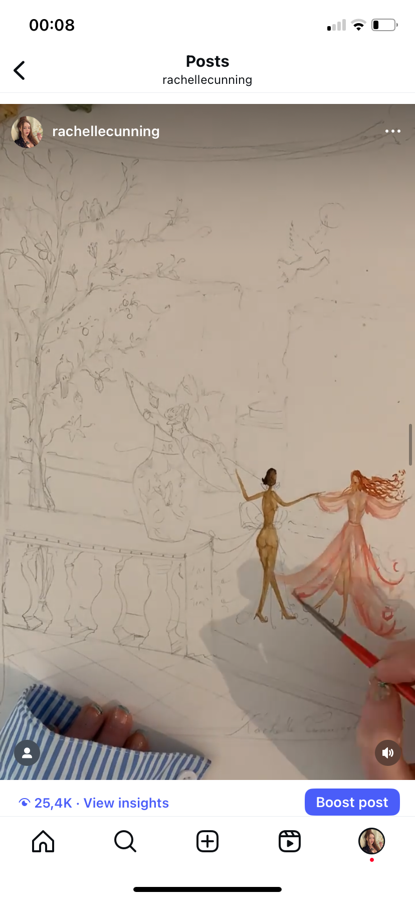 Nina Ricci reached out to Rachelle Cunningham for the launch of their new collaboration with Antoinette Poisson “ L’air du temps”, wanting her to come up with a painting they could place their newest product in. Creating a reel to showcase the process of the painting adding a poetic touch to the very artistic, romantic, poetic collaboration they made.